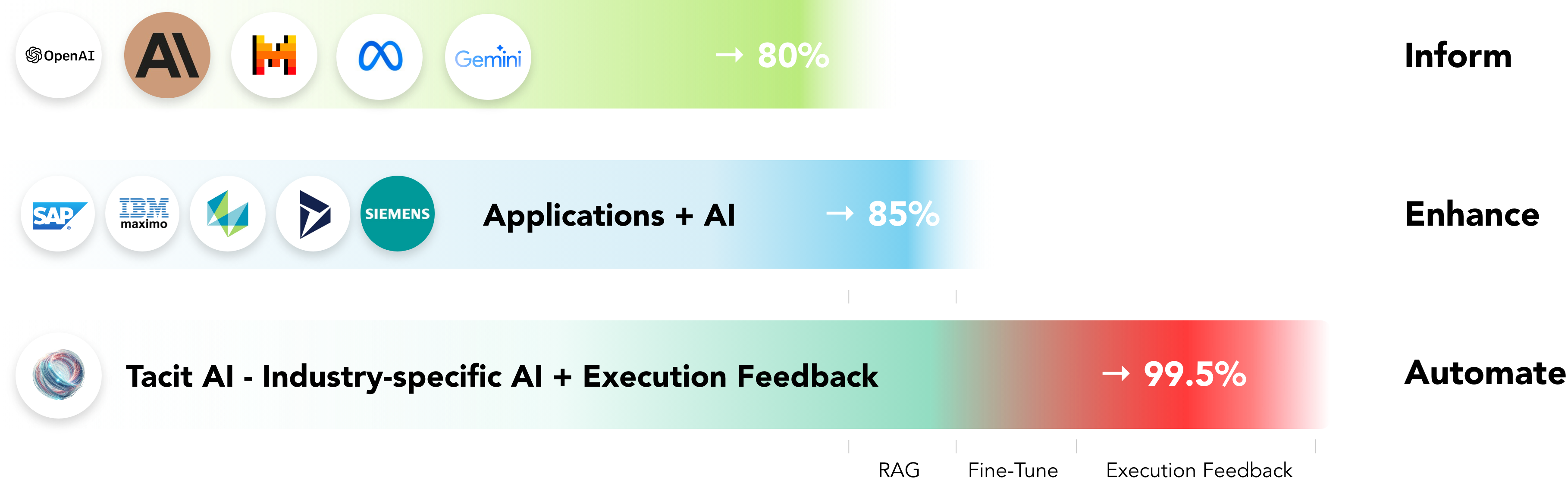 Tacit AI layers on top of your existing systems - SAP, Maximo, IFS, and Hexagon - enhancing them with intelligence from terabytes of unstructured data, patterns and feedback loops.